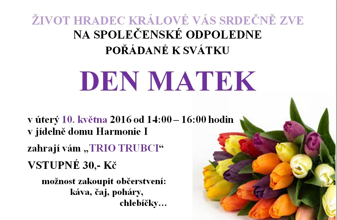 Život Hradec Králové o. p. s. tímto srdečně zve obyvatele domu Harmonie I a seniory z okolních domů na společenské odpoledne pořádané k svátku DEN MATEK, které se koná 10.5.2016 od 14:00 v jídelně domu Harmonie I.
